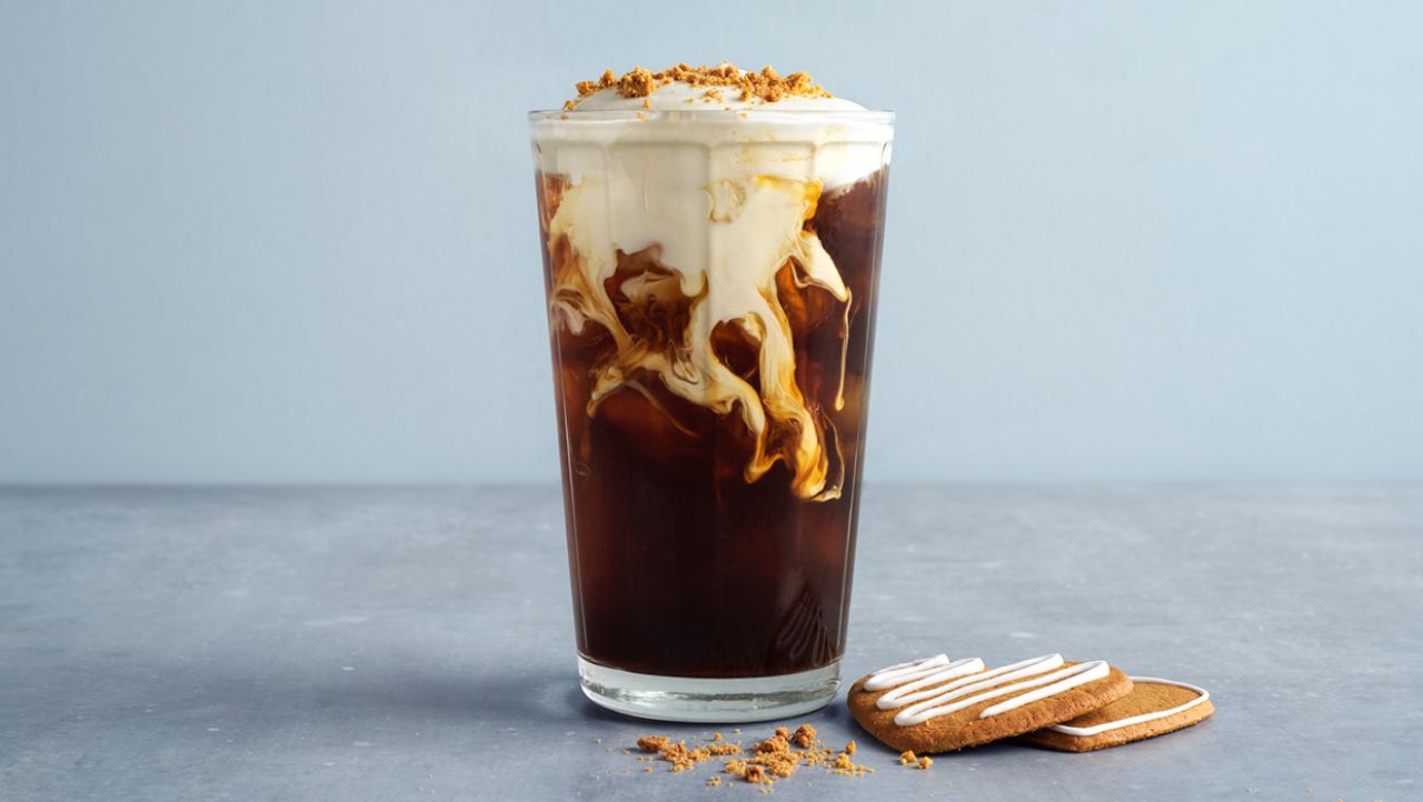 En krämig islatte där kryddig, varm pepparkakssmak möter kaffe – toppade med ett fluffigt moln av lätt, krämigt foam och pepparkakssmulor. Välj mellan gräddfoam eller växtbaserat kokosfoam.