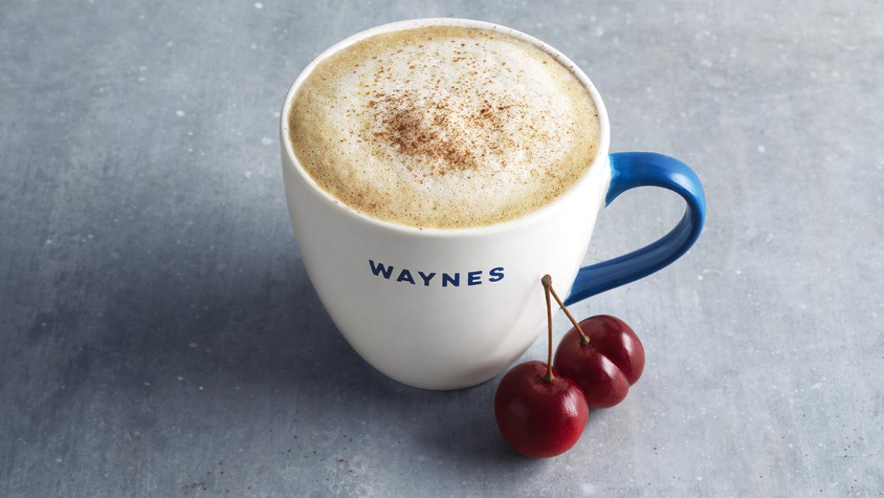 En krämig latte på mjölk eller växtbaserad dryck, med fyllig körsbärscoulis och ett lent moln av kokosfoam.