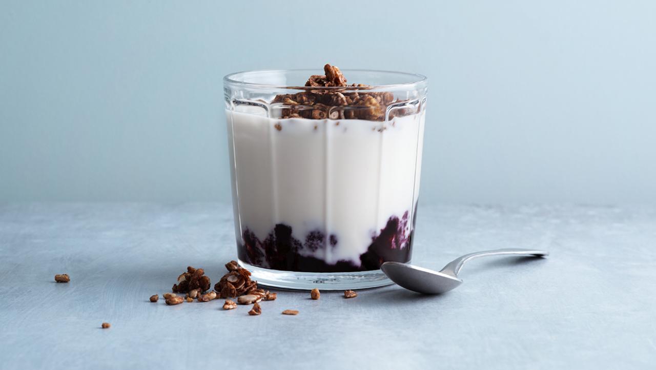 Ingredienser: Naturell YOGHURT (Högpastöriserad MJÖLK, mild yoghurtkultur, vitamin D), Blåbärssylt (blåbär, socker, vatten, pektin, citronsyra, konserveringsmedel(E202,E211)) och Granola (HAVREFLINGOR, oligofruktos, torkade dadlar 9%, rapsolja, DINKELFLINGOR, äppelkoncentrat, kokos, torkade hallon 2,0%, kakao 1,3% och havssalt. Kan innehålla spår av JORDNÖTTER och NÖTTER)