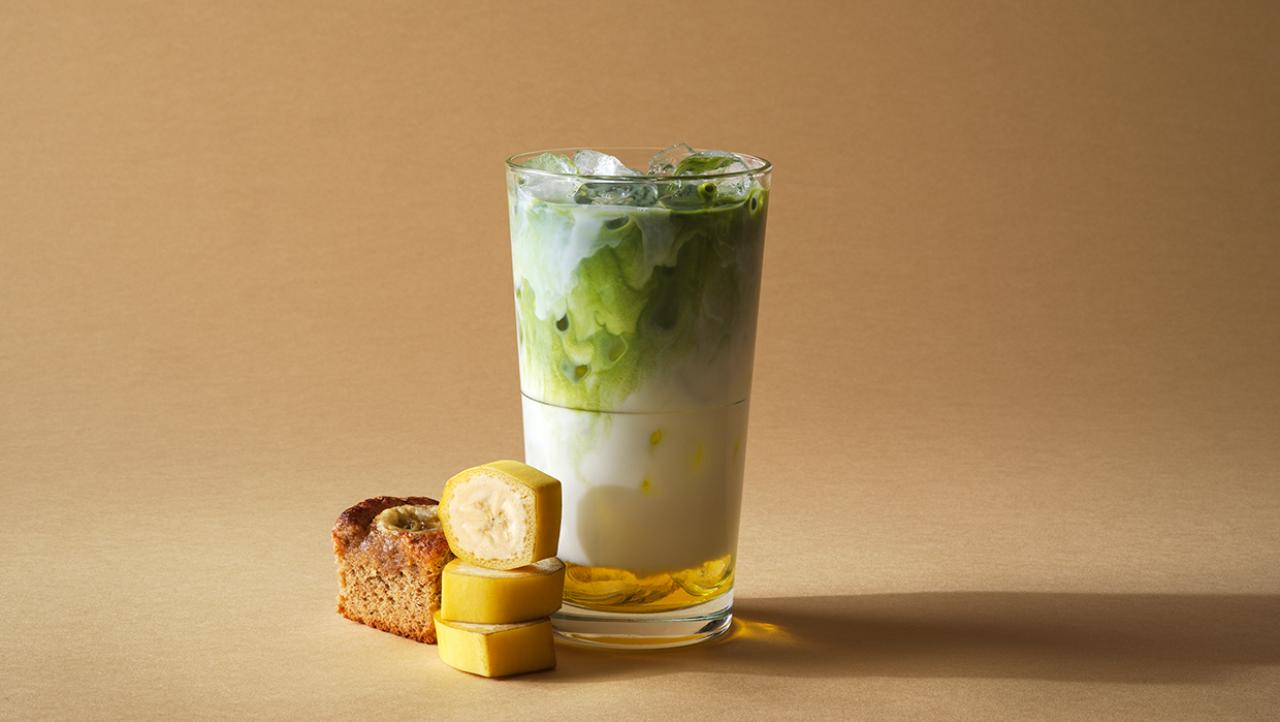 Uppfriskande ismatcha latte, baserad på 100% matcha av ceremoniell kvalitet, med en kryddigt söt smak av bananbröd.
