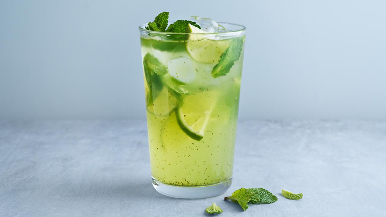 Vatten, socker, limejuice, mynta, citronsyra Konserveringsmedel: natriumbensoat, kalium sorbat. Aromer, färgämne: betakaroten, och E133