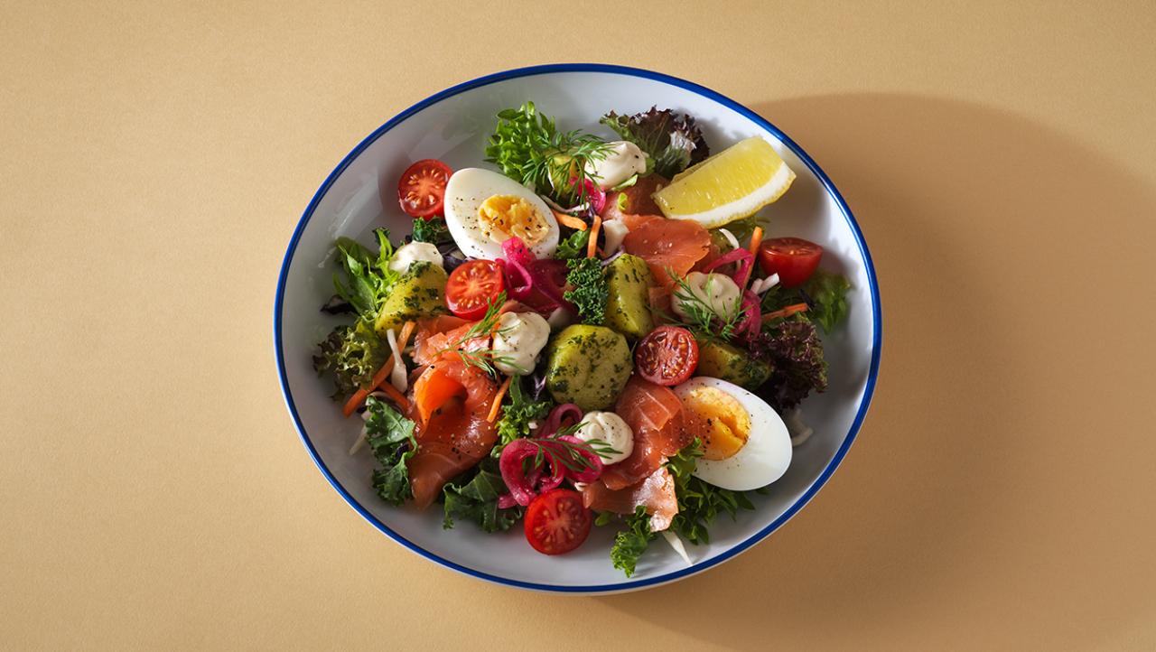 Vår fräscha Fresh Plate-salladsbas med örtpotatis, kokt ägg, picklad rödlök och krämig senaps- och honungsmajonnäs. Serveras med ditt val av protein: Kallrökt lax, Kyckling, Handskalade räkor, Burrata eller Tofu.